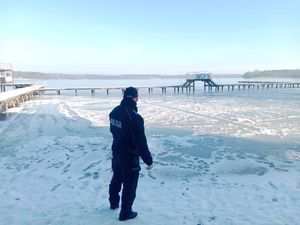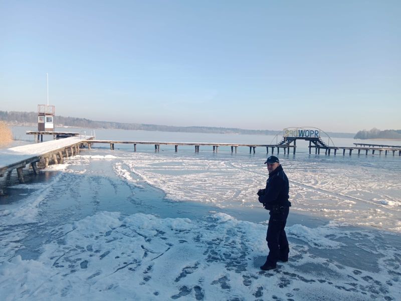 Dzielnicowy realizując swoje zadania w rejonie służbowym, zwracał szczególną uwagę na bezpieczeństwo osób przebywających w pobliżu jeziora. Funkcjonariusze sprawdzali, czy nikt, a zwłaszcza dzieci i młodzież nie wchodzi na zamarzniętą taflę lodu, która mimo niskich temperatur nie jest bezpieczna.