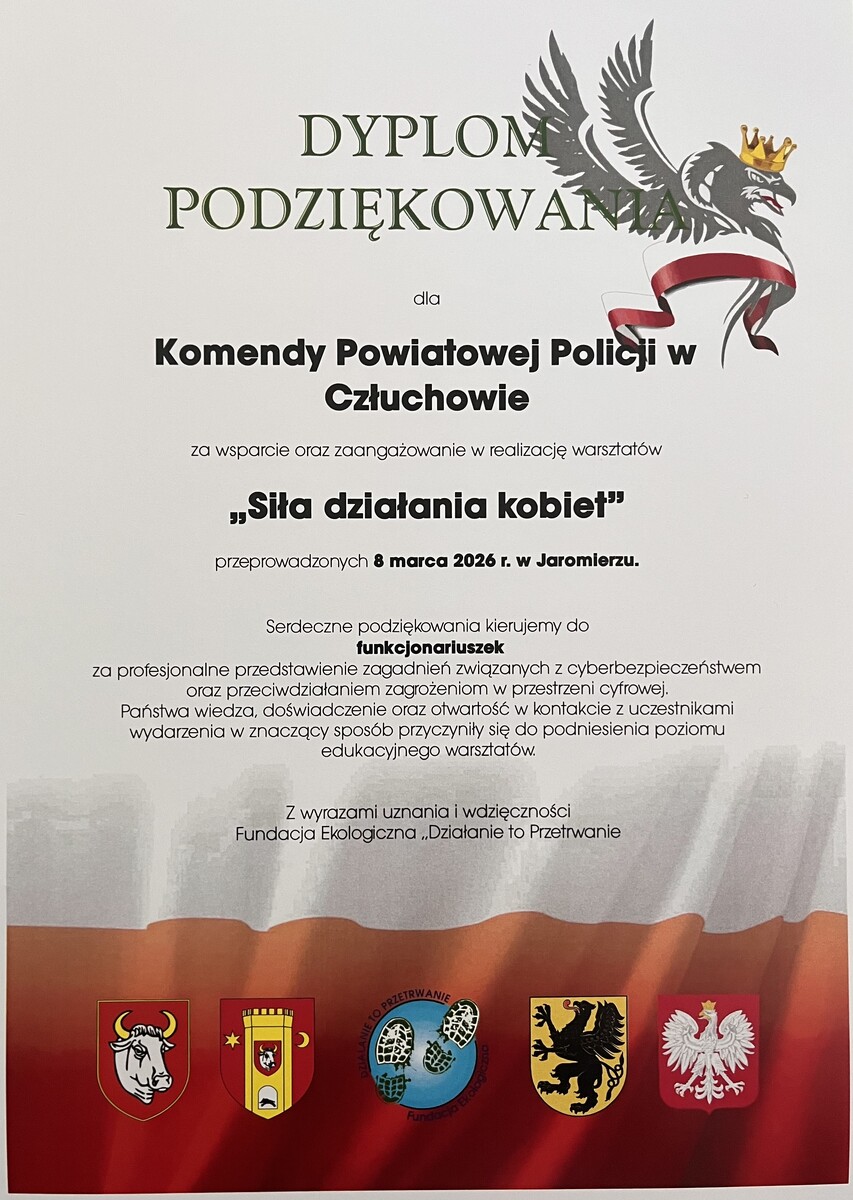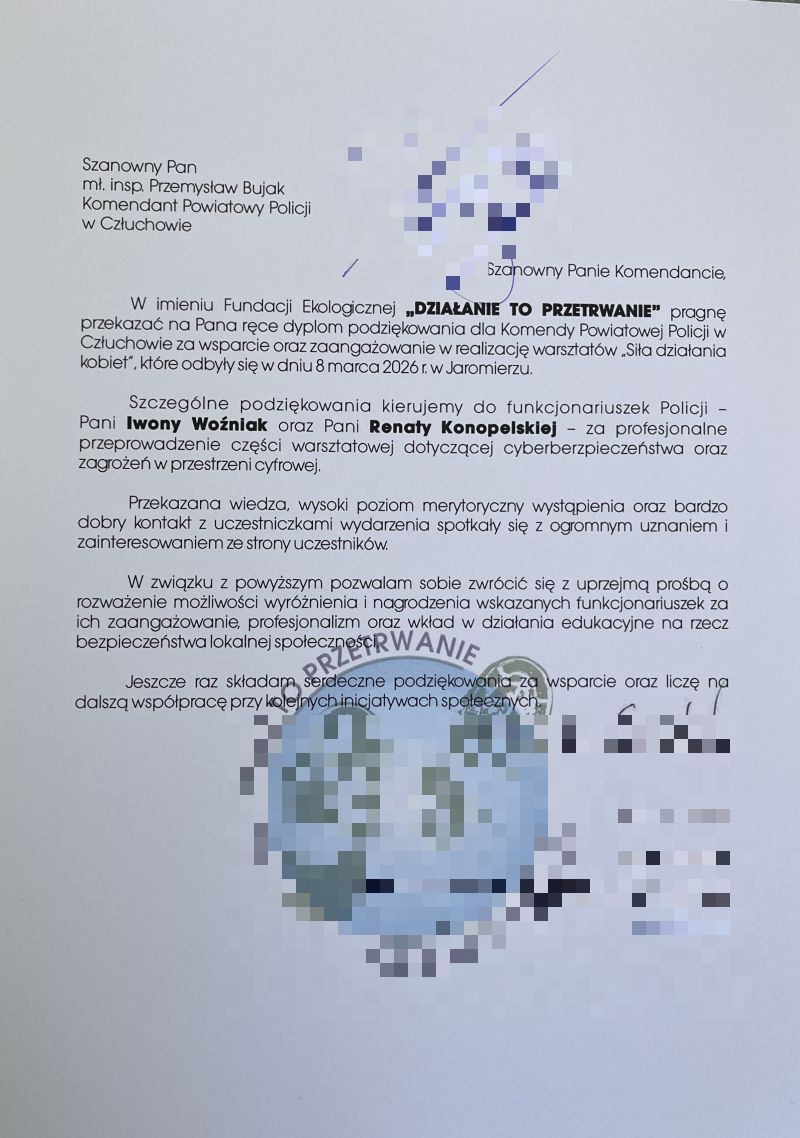 Tego samego dnia do Komendy wpłynęło również pismo w imieniu Fundacji Ekologicznej „Działanie do Przetrwanie”, zawierające podziękowania za wsparcie oraz zaangażowanie w realizację warsztatów „Siła Działania Kobiet”, które odbyły się 8 marca w Jaromierzu.
