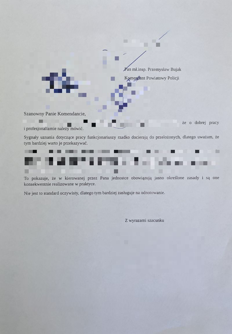 Wczoraj na ręce Komendanta wpłynęło pismo wyrażające pochwałę dla jednego z naszych funkcjonariuszy działających w obszarze dochodzeniowo-śledczym. Choć nie możemy ujawniać szczegółów prowadzonego postępowania, jest to wyraźny dowód na to, że rzetelna, wymagająca i czasochłonna praca policjantów jest dostrzegana i doceniana. Jak podkreślono, sygnały uznania rzadko trafiają do przełożonych, dlatego tym bardziej warto je nagłaśniać.
